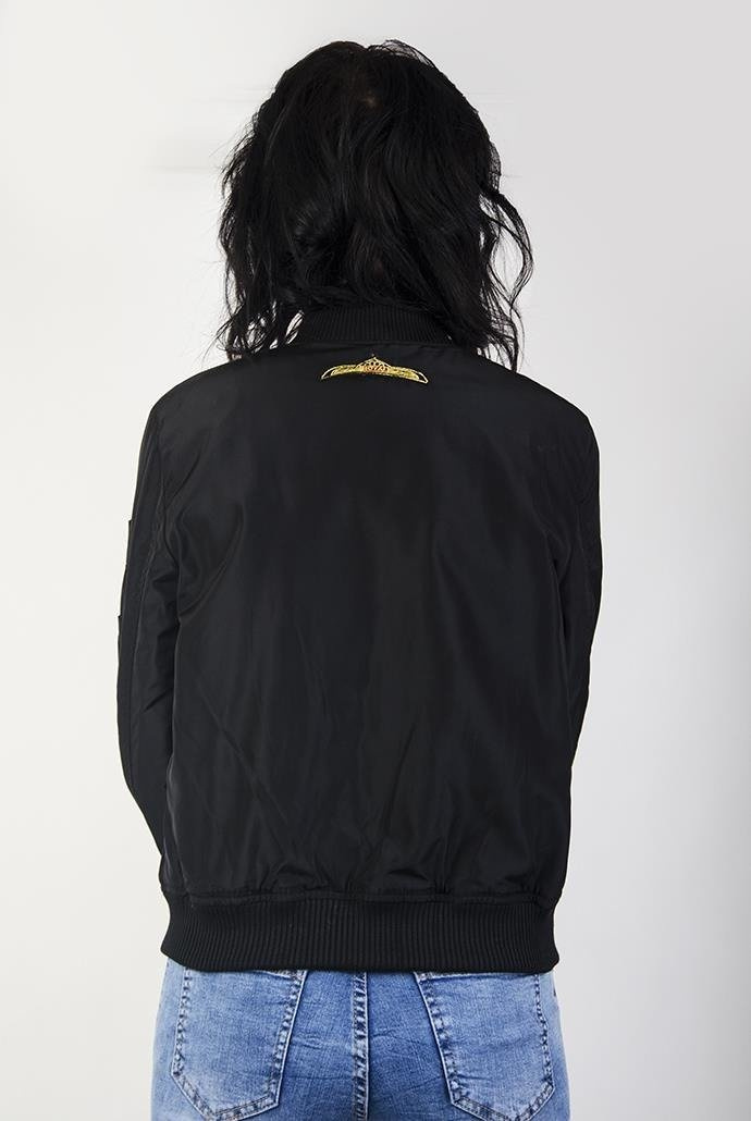 Czarna kurtka z naszywkami typu bomber