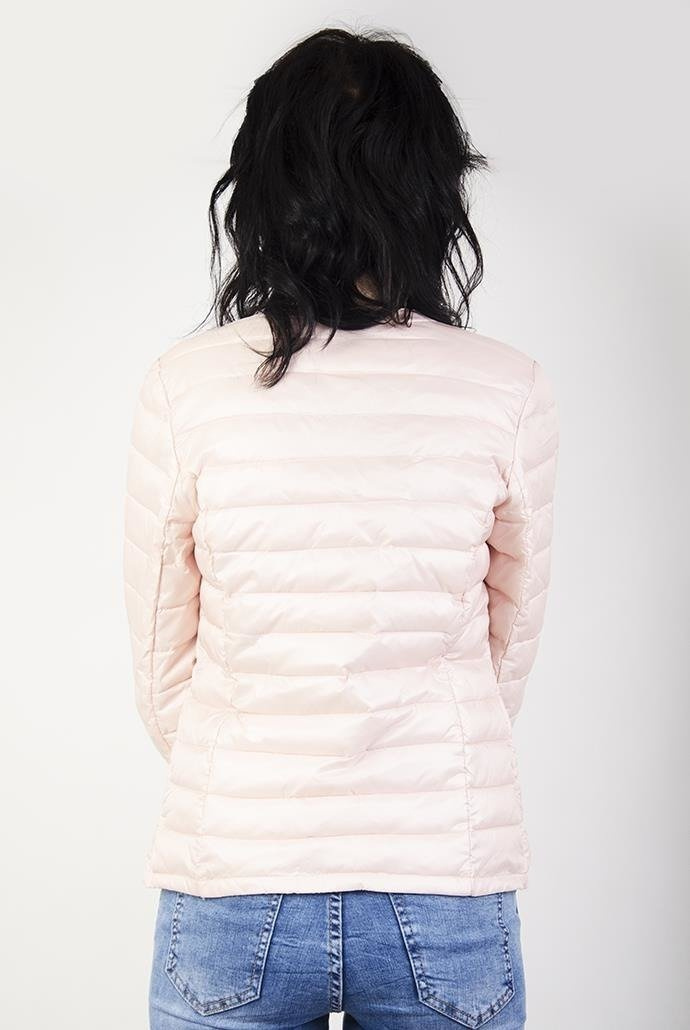 Jasnoróżowa kurtka pikowana z zamkami przy kieszeniach.