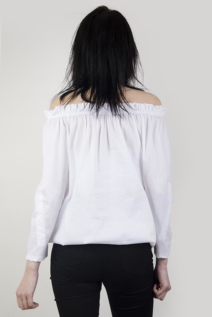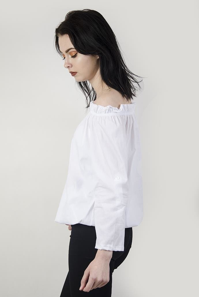 Biała bluzka z szerokim dekoltem i gumką na górze i dole.