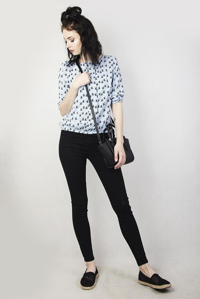 Jasnoniebieska bluzka w czarne jaskółki. Posiada gumkę na dole oraz przy rękawie.