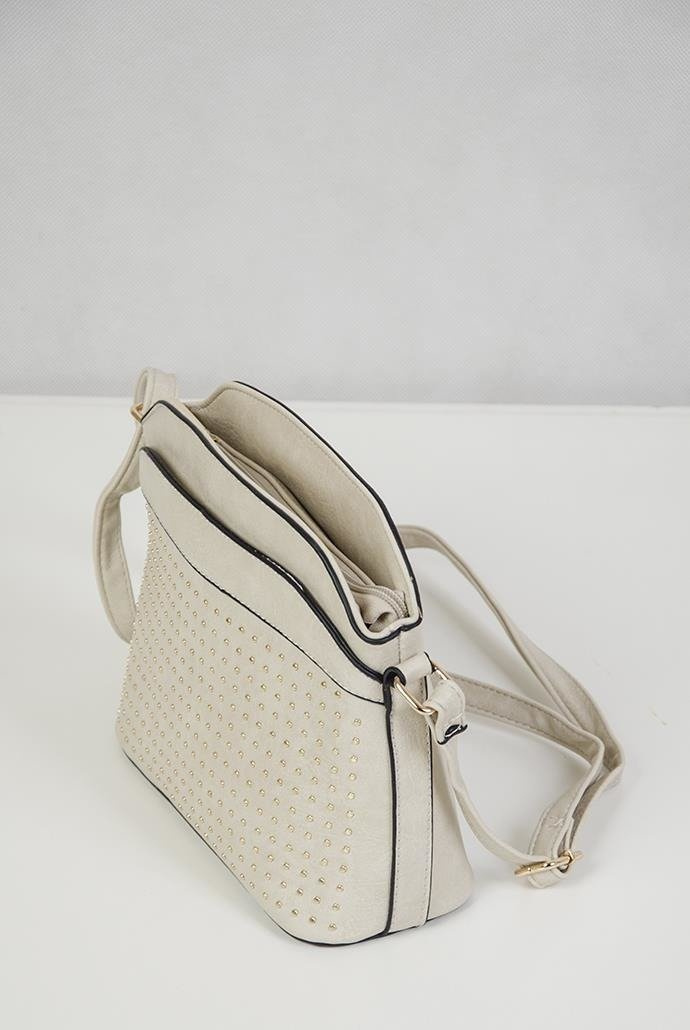 Kremowa, mała torebka zdobiona ćwiekami. W środku posiada kieszonki na klucze czy portfel.Torebka ma regulowany pasek.