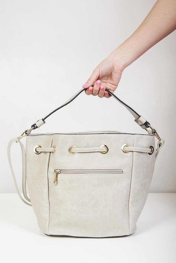 Kremowa torebka z przeplotem, zdobiona zamkami. Posiada długi pasek w zestawie.