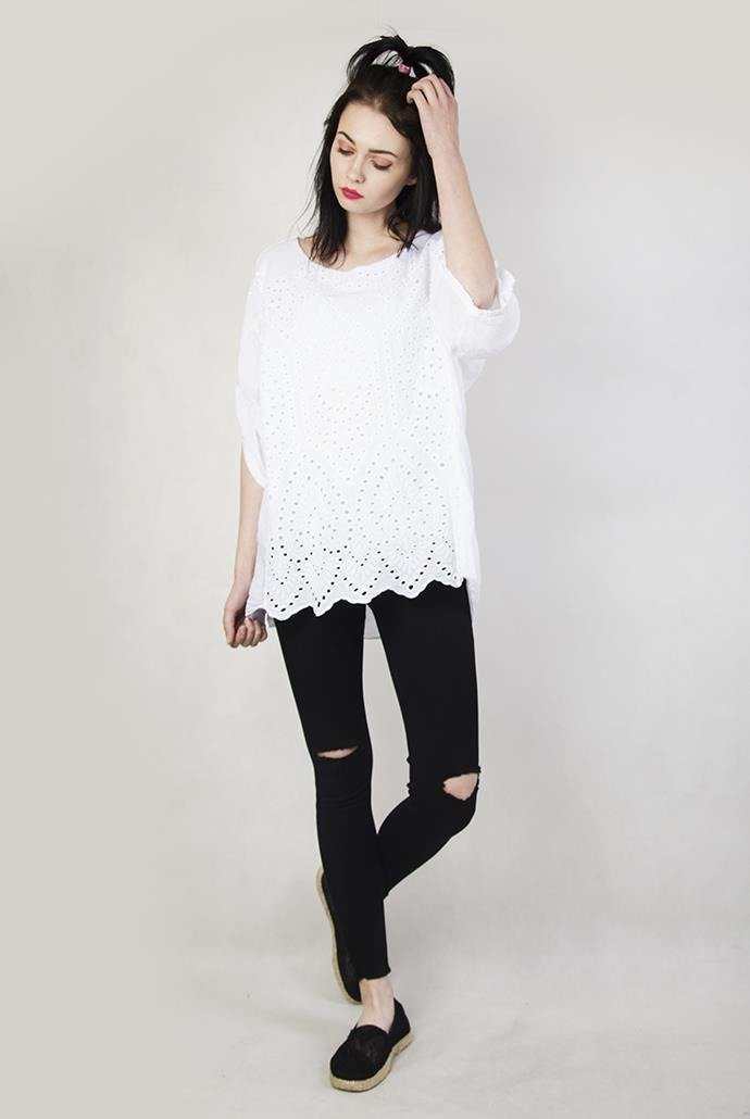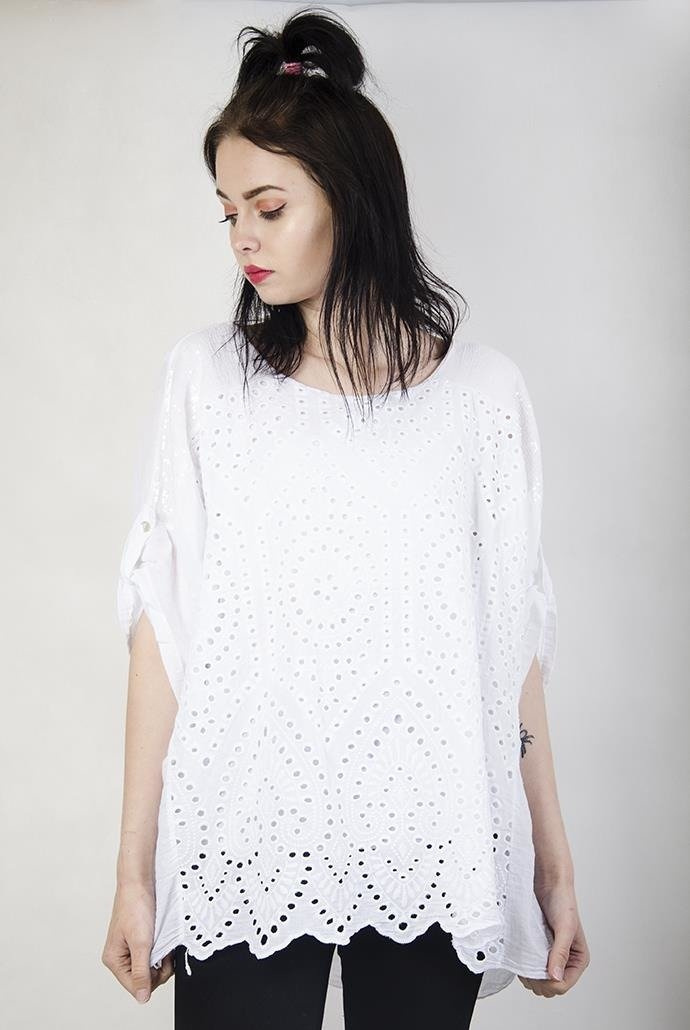 Biała bluzka z wyciętym wzorem, z cekinami przy ramionach.