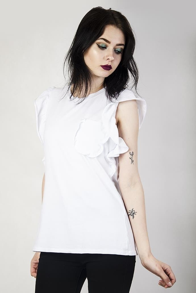 Biała bluzka z kieszonką i falbankami.