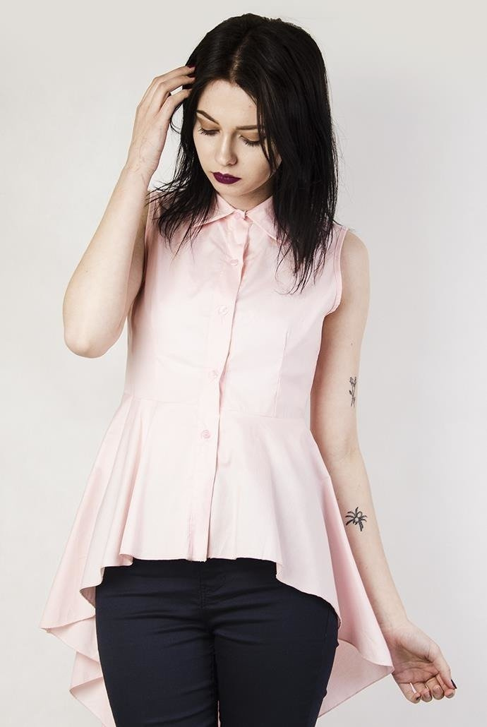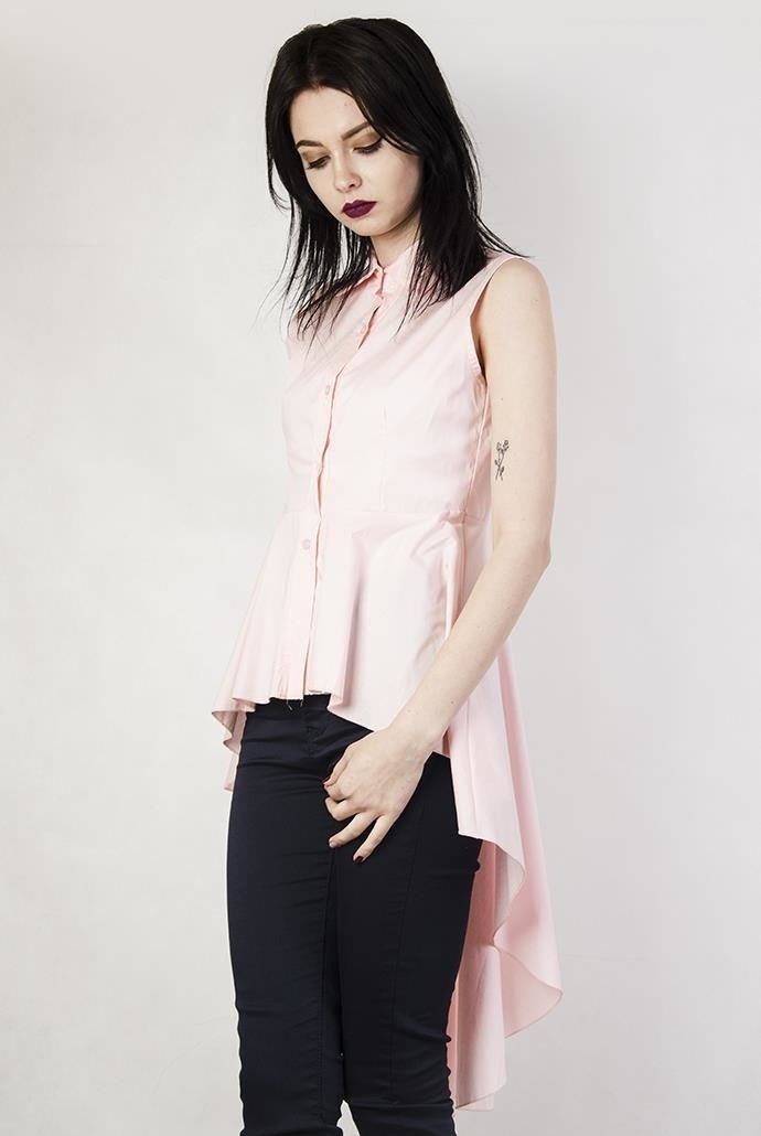 Jasnoróżowa koszula zapinana na guziki, z przedłużanym tyłem.