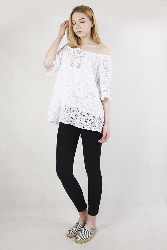Biała bluzka ażurowa, z hiszpańskim dekoltem