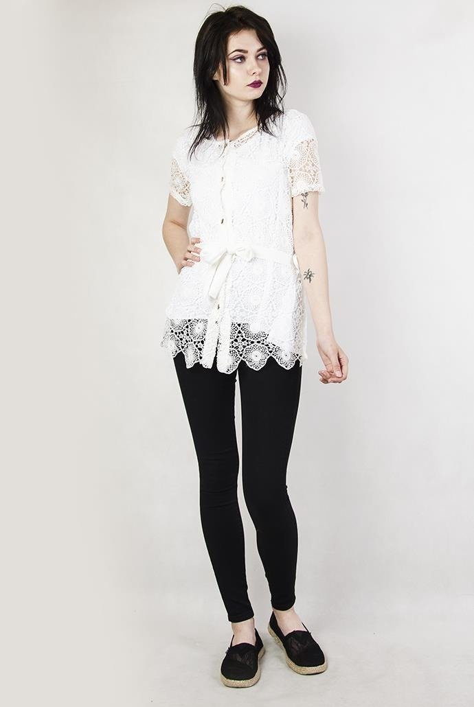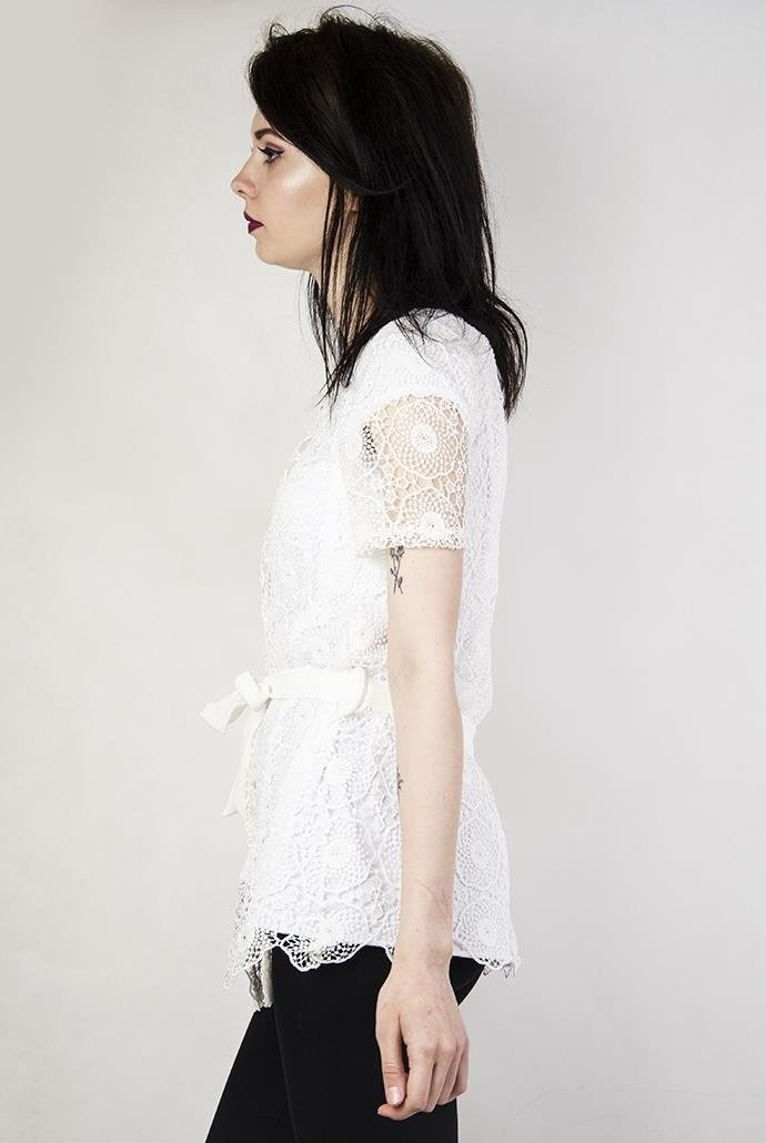 Biała ażurowa narzutka zapinana na guziki. Posiada wstążkę w pasie.