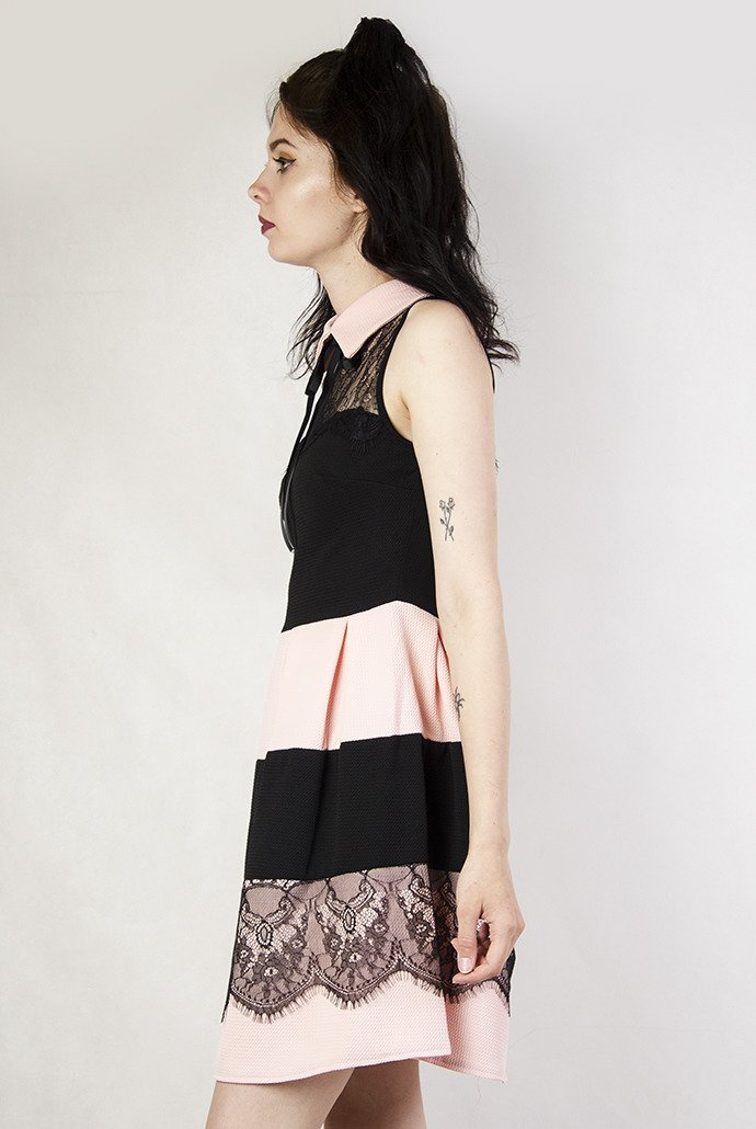 Różowo-czarna sukienka z koronkowymi wstawkami. Posiada wstążkę przy szyi.