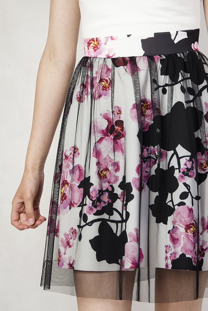 Biała sukienka z dołem w kwiaty, z siateczkowym obszyciem