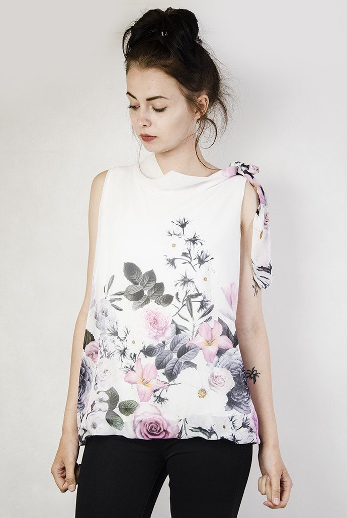 Biała, zwiewna bluzka z wiązaniem przy ramieniu, w kwiaty.