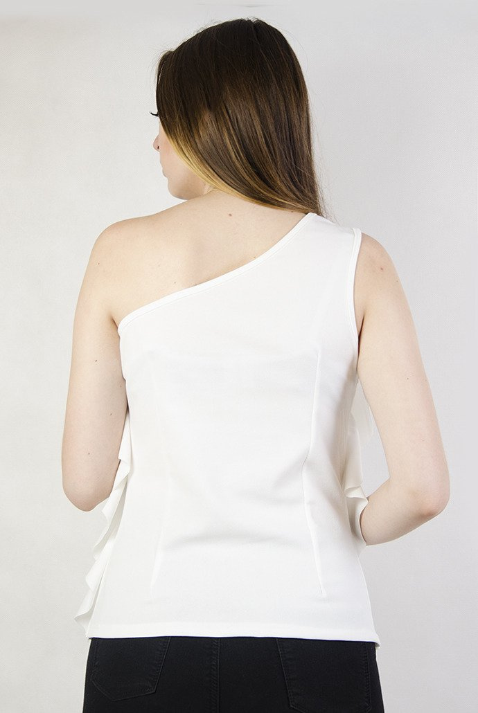 Biała bluzka na jedno ramię z falbanami