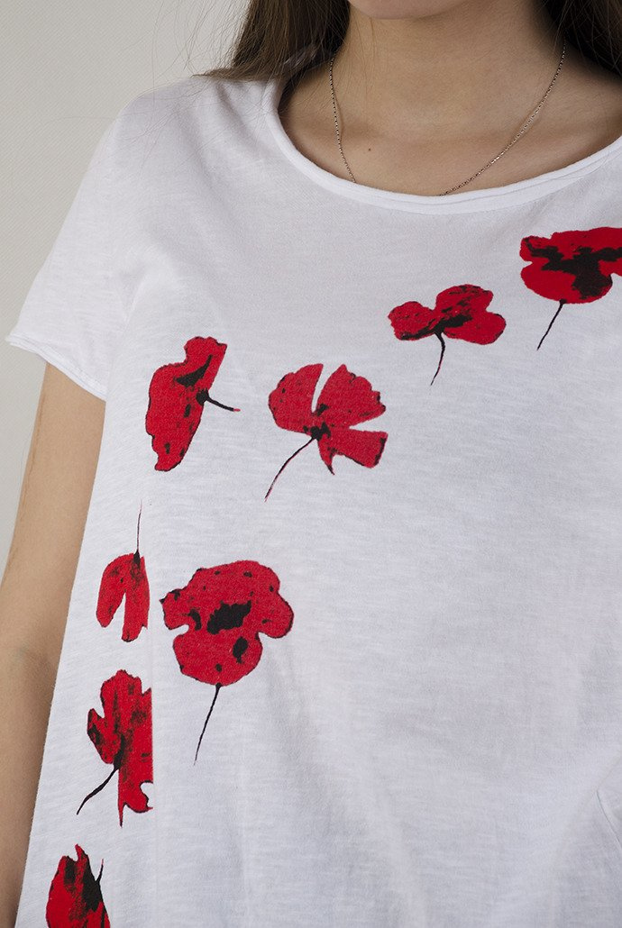 Biała bluzka w maki. Posiada nadruk zarówno z przodu jak i z tyłu.