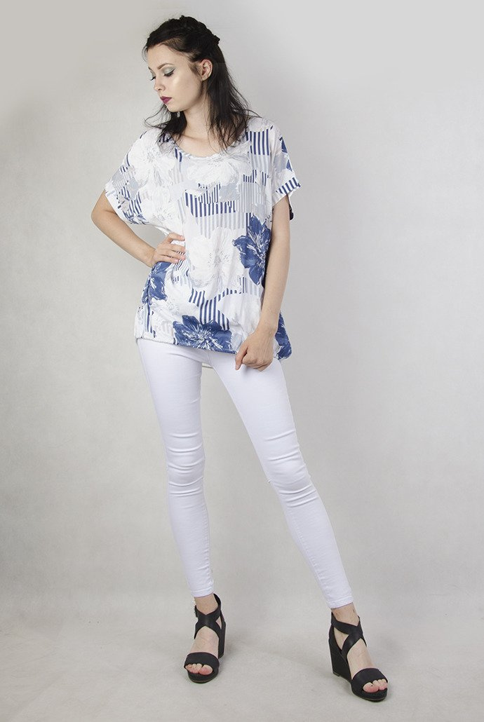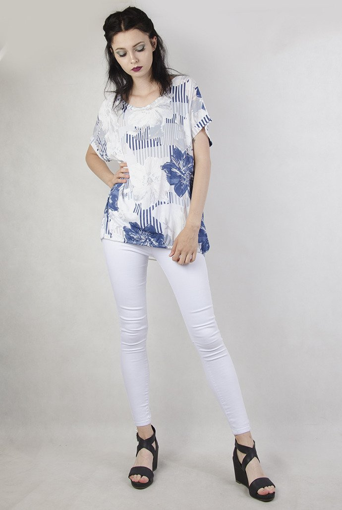 Biała bluzka w niebieskie kwiaty. Wiązana z tyłu.