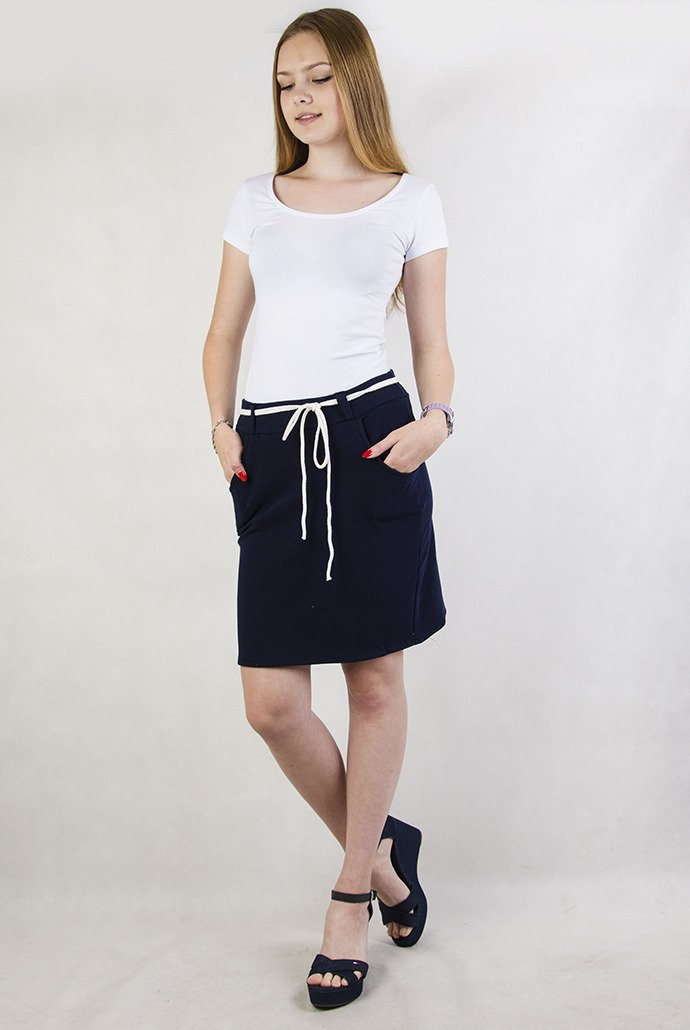 Krótka, granatowa spódniczka z wiązaniem.