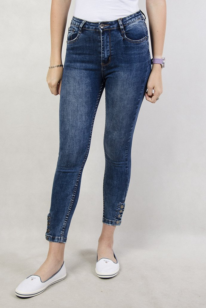 Spodnie jeansowe z wysokim stanem. Posiadają 4 zatrzaski przy nogawce.