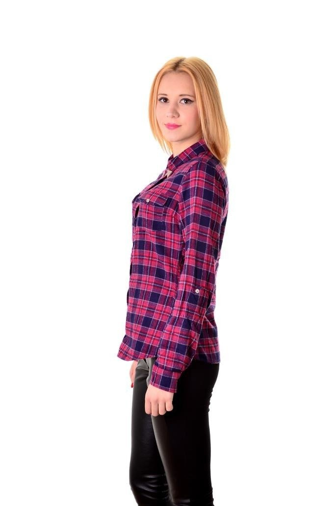 Bardzo stylowa, zapinana na zatrzaski koszula w kratę. Z przodu dwie kieszenie, oraz efektownie zdobiony kołnierzyk.