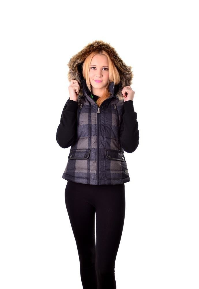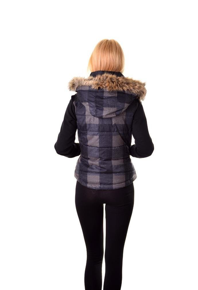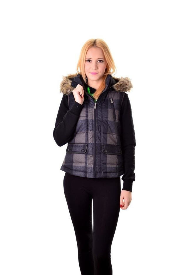 Ciepła kamizelka z kapturem, wykończonym futerkiem. Z przodu kieszenie, zapinane na zatrzaski, obszyte skórą ekologiczną.