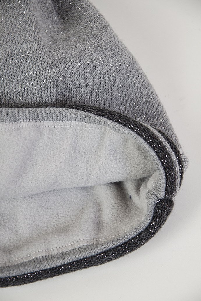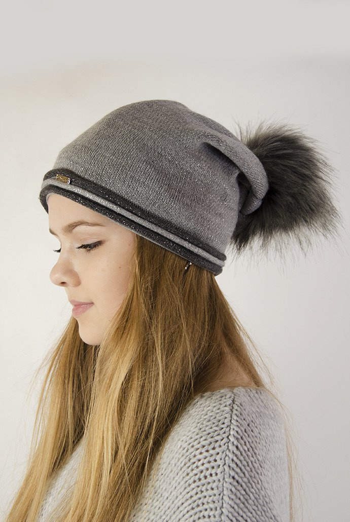 Jasnoszara czapka z ciemnoszarą obwódką i pomponem.