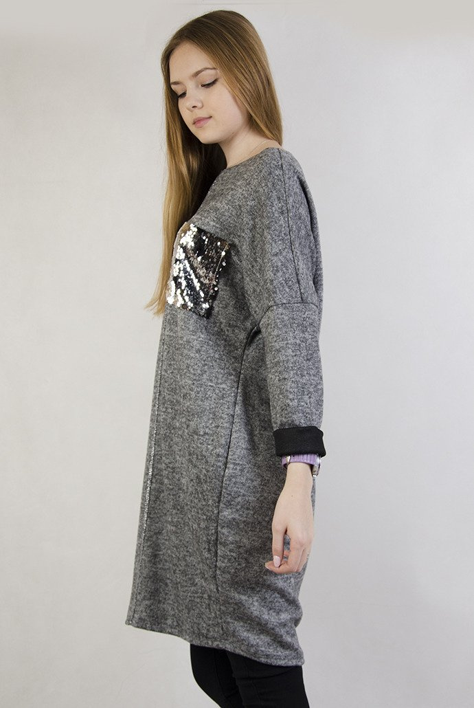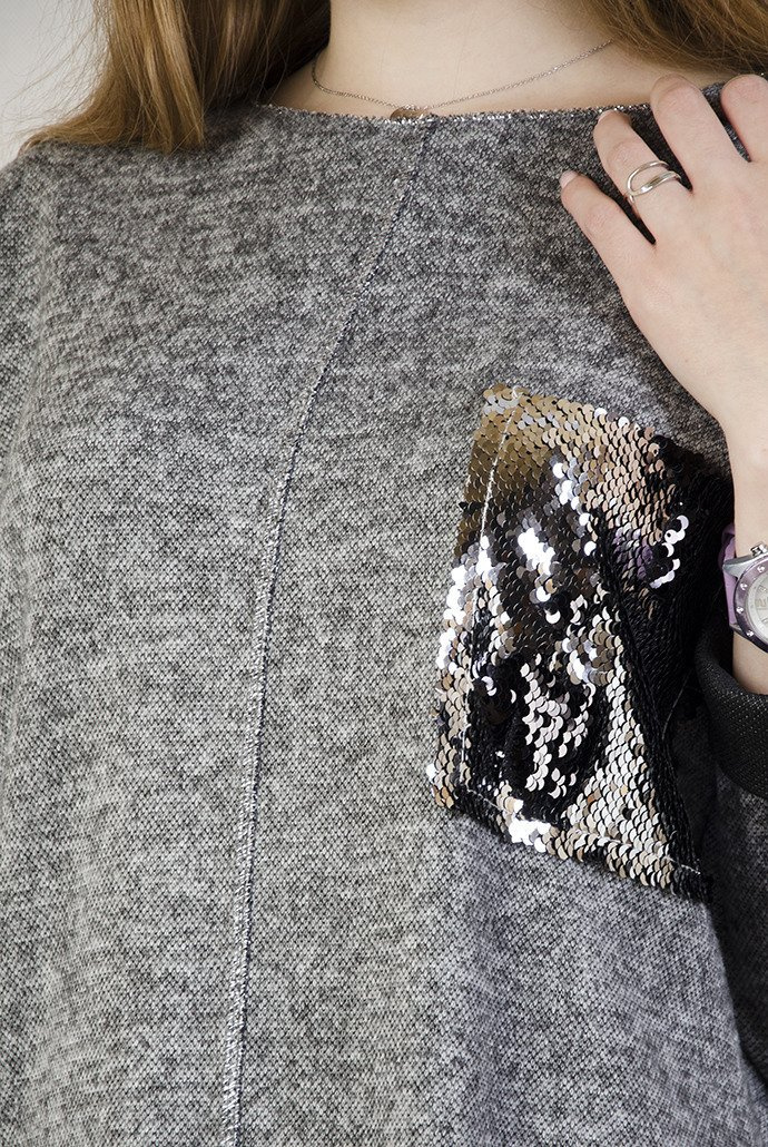Ciemnoszara tunika z cekinową kieszenią oraz przeplatana srebrną nicią