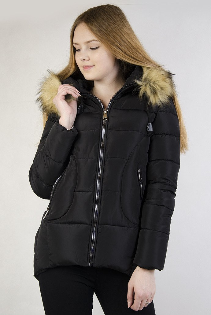 Czarna asymetryczna kurtka z pikowaniem oraz futerkiem przy kapturze