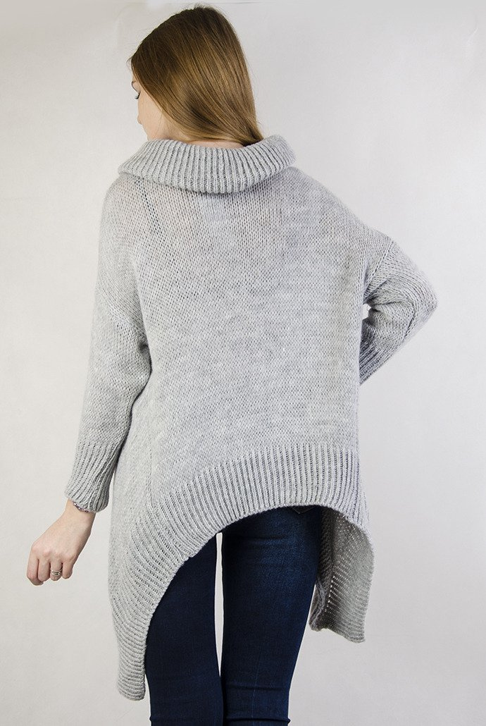 Szary sweter z luźnym golfem oraz przedłużanymi bokami.