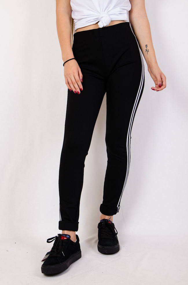 Czarne materiałowe spodnie z białymi paskami po bokach.