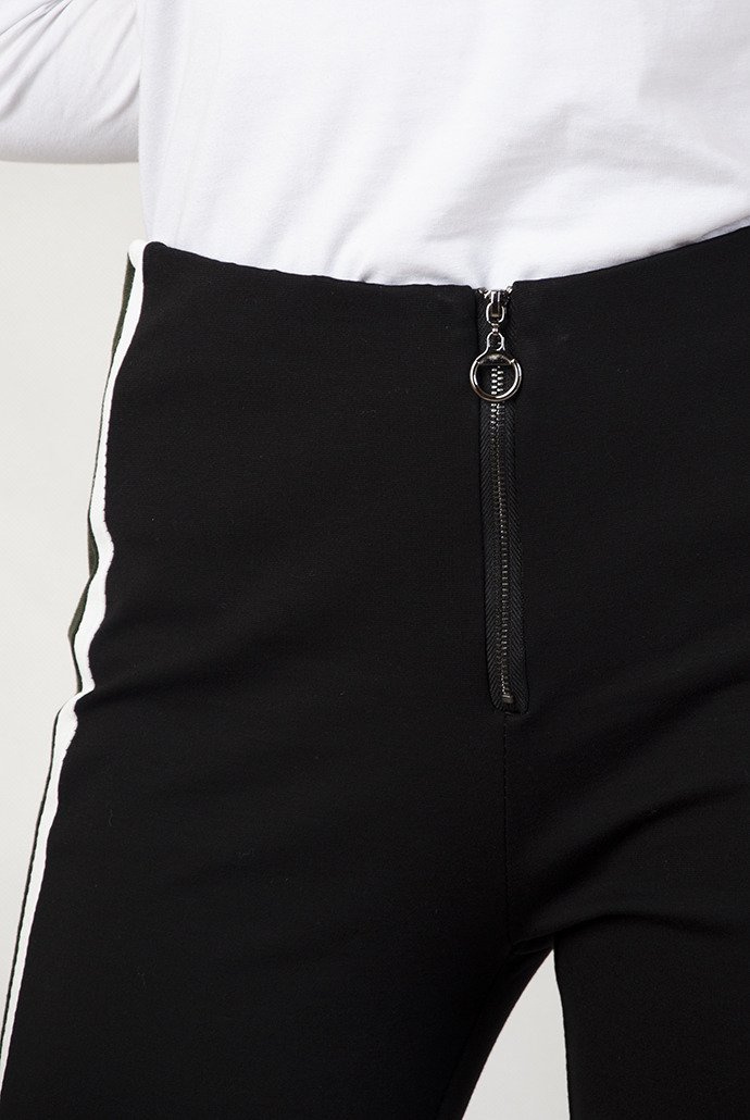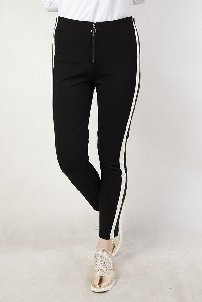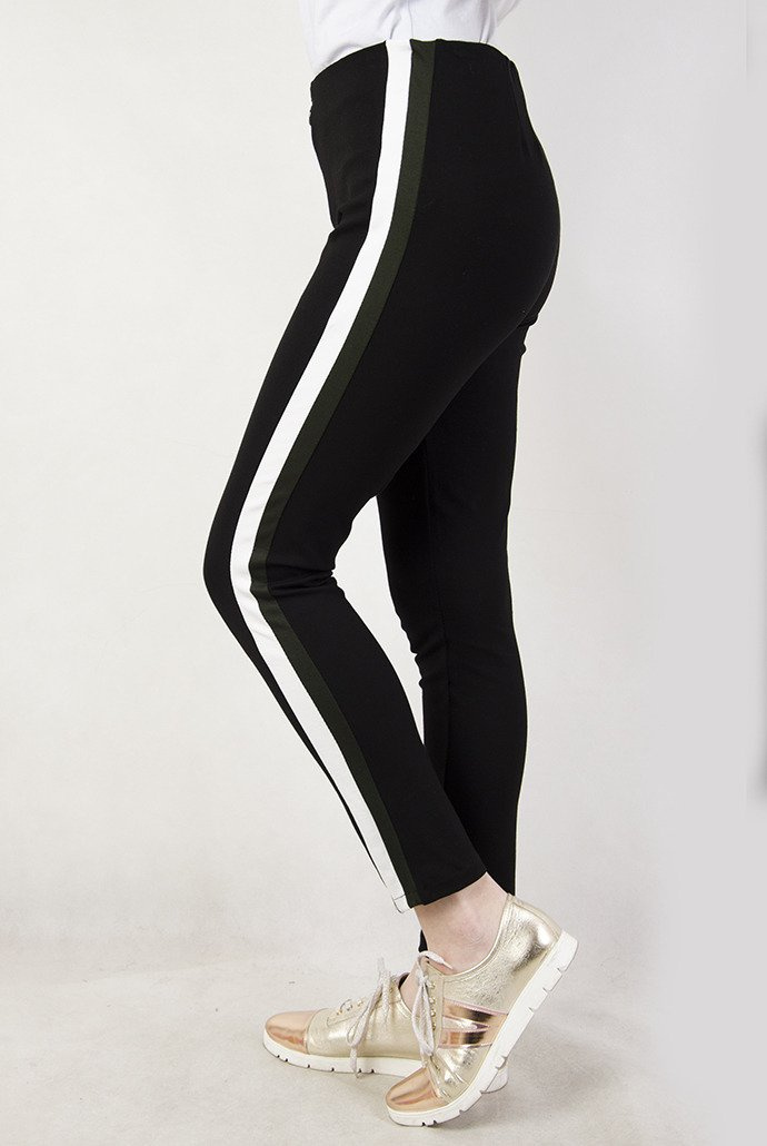 Czarne materiałowe spodnie z biało-zielonymi paskami