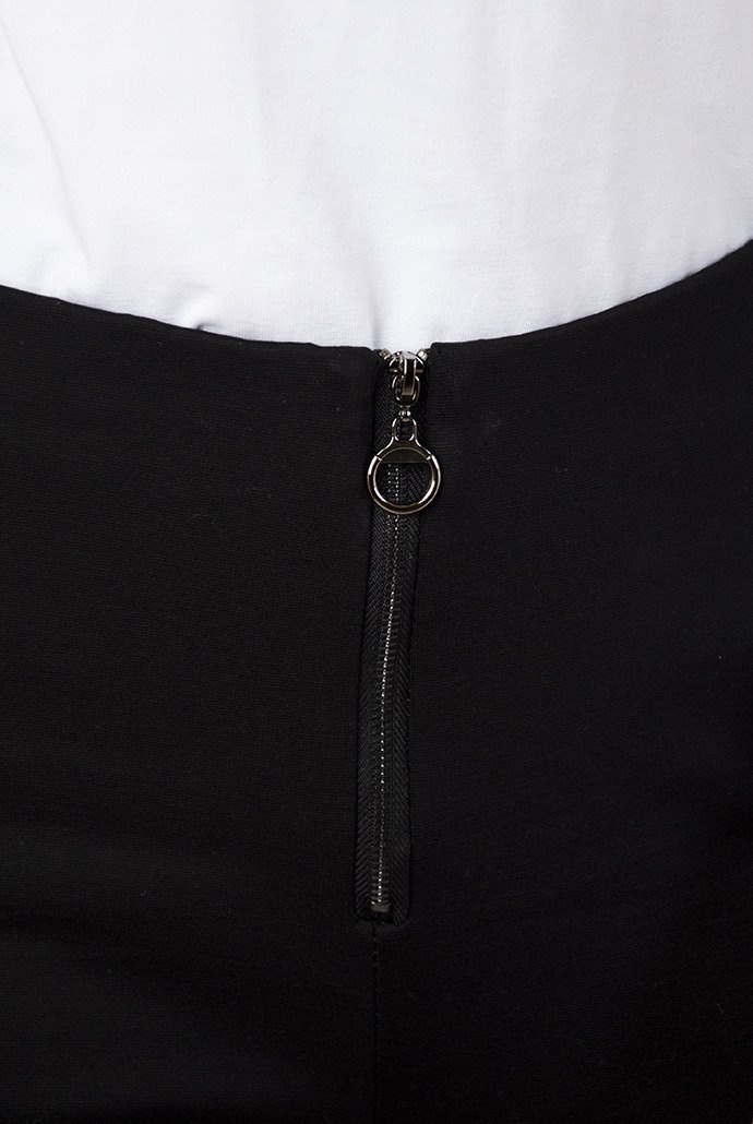 Spodnie posiadają gumę w pasie oraz są zapinane na zamek.