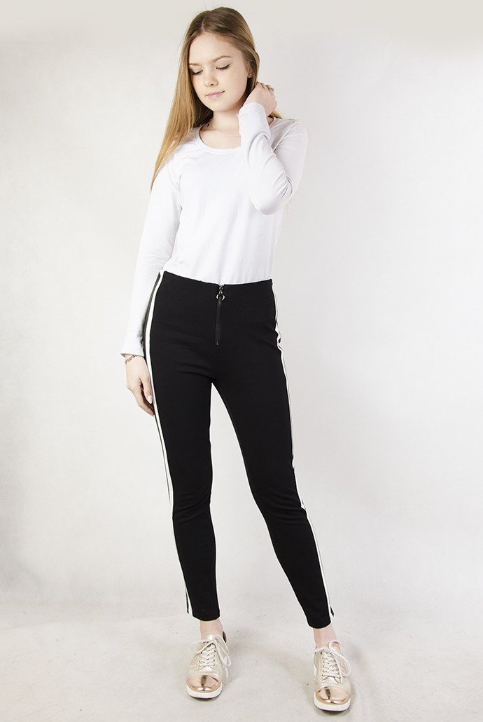 Czarne materiałowe spodnie z  biało-zielonymi paskami