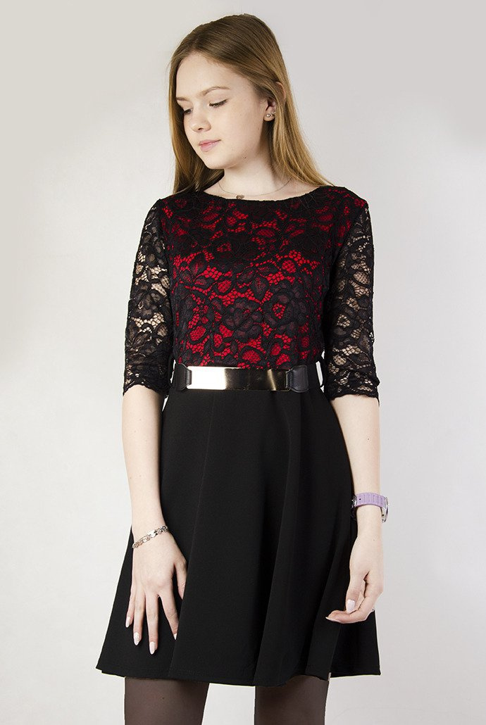 Czarno-czerwona sukienka z górą z koronki oraz rozkloszowanym gładkim dołem.
