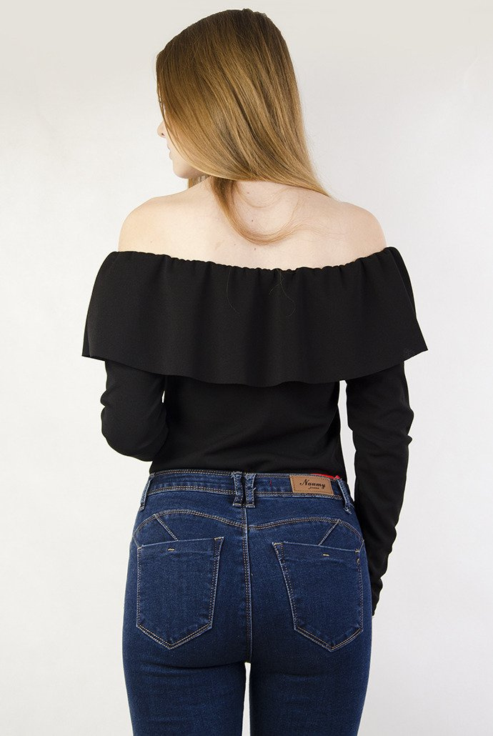 Czarne body z hiszpańskim dekoltem oraz długim rękawem.