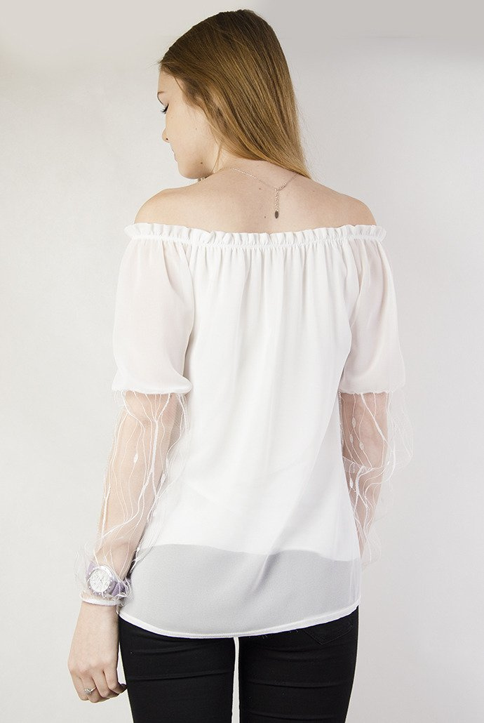 Biała bluzka z dekoltem w łódkę oraz rękawami z siateczki