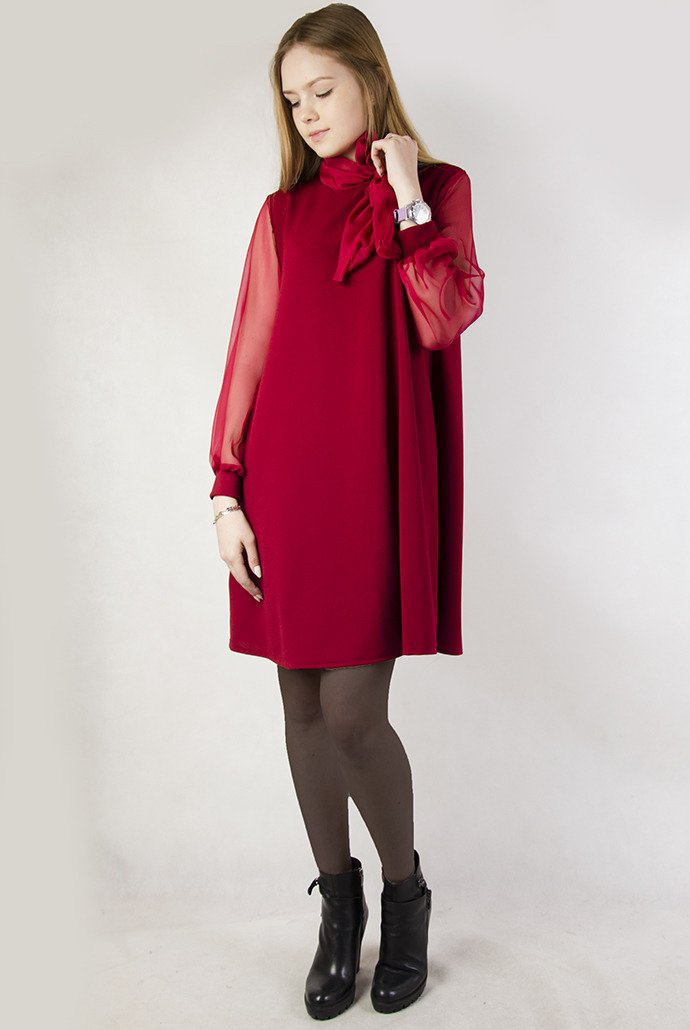 Zwiewna bordowa sukienka z rękawami z tiulu
