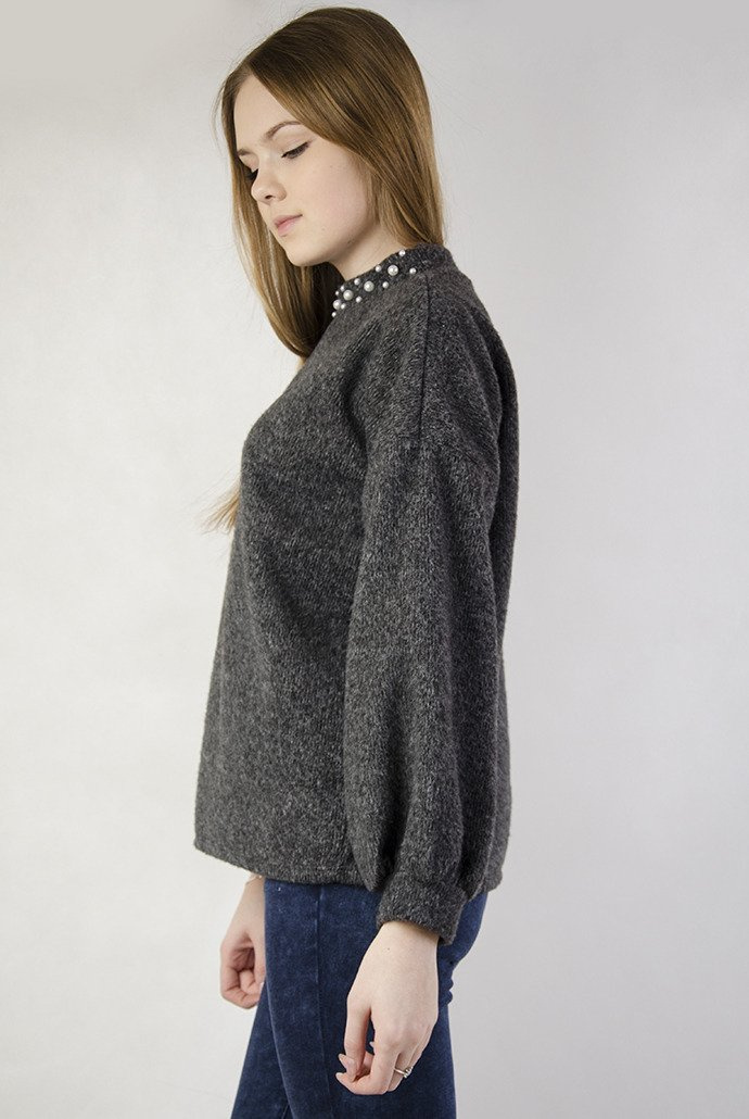Ciemnoszary sweterek z perełkami przy szyi oraz bufiastymi rękawami