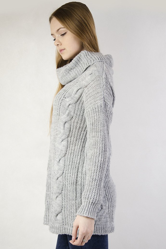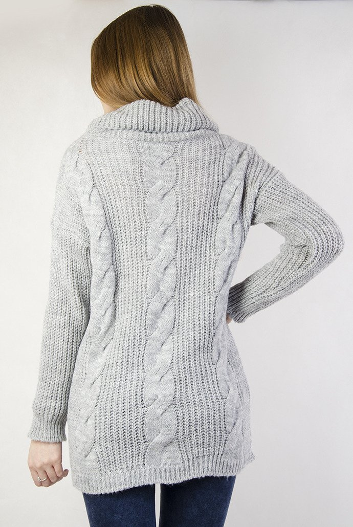 Szary sweter z trzema warkoczami z przodu