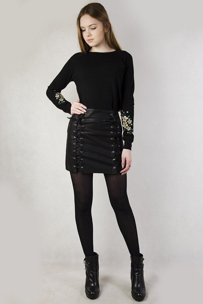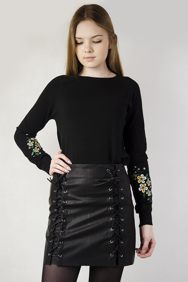 Czarny sweterek z kwiatami haftowanymi na rękawach