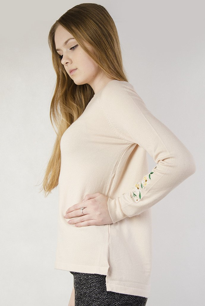 Beżowy sweterek z kwiatami haftowanymi na rękawach