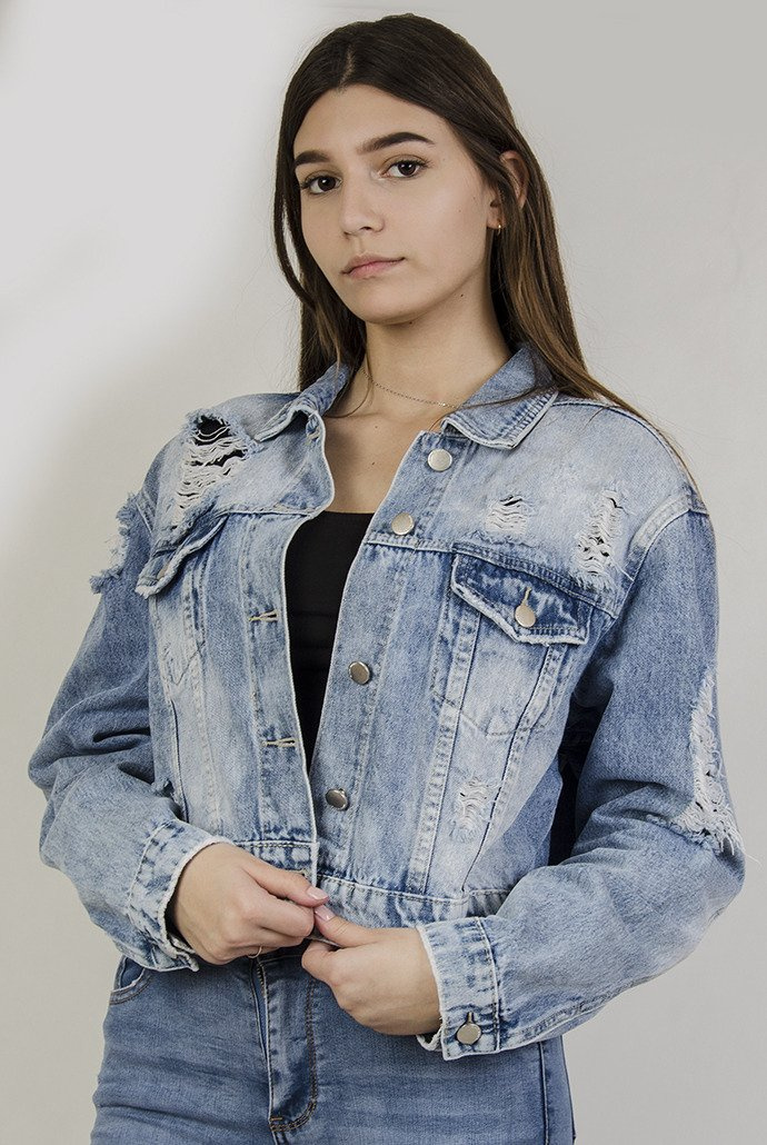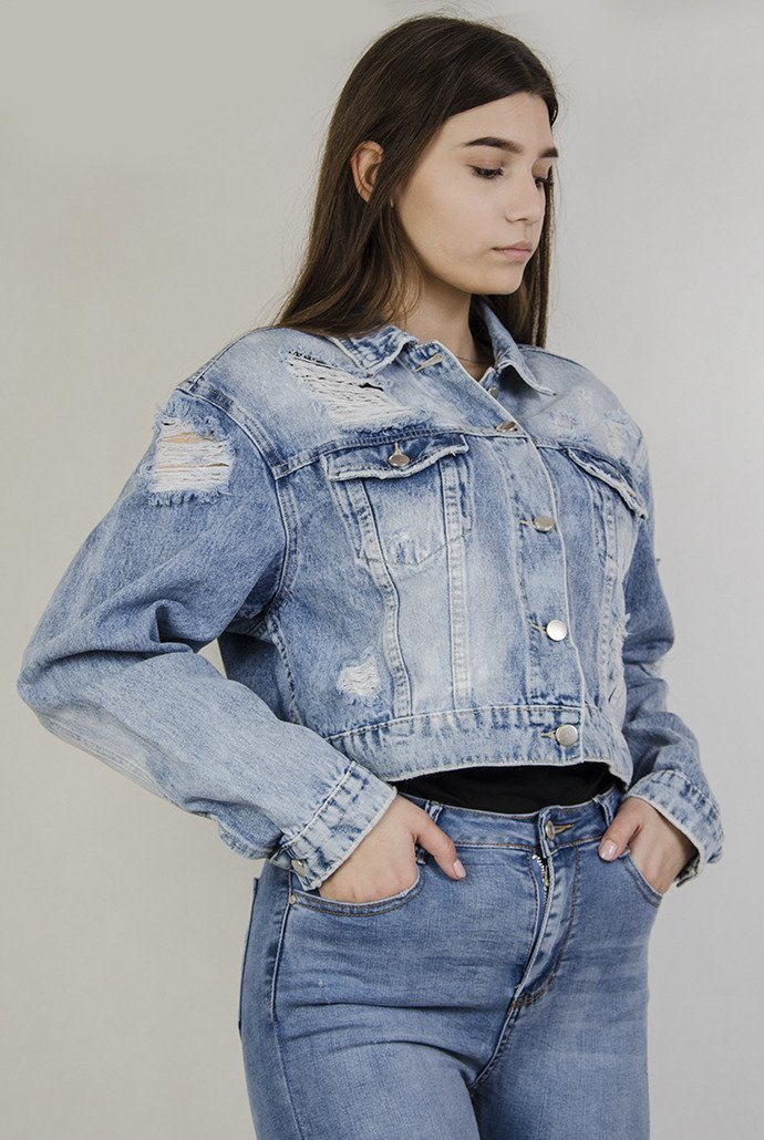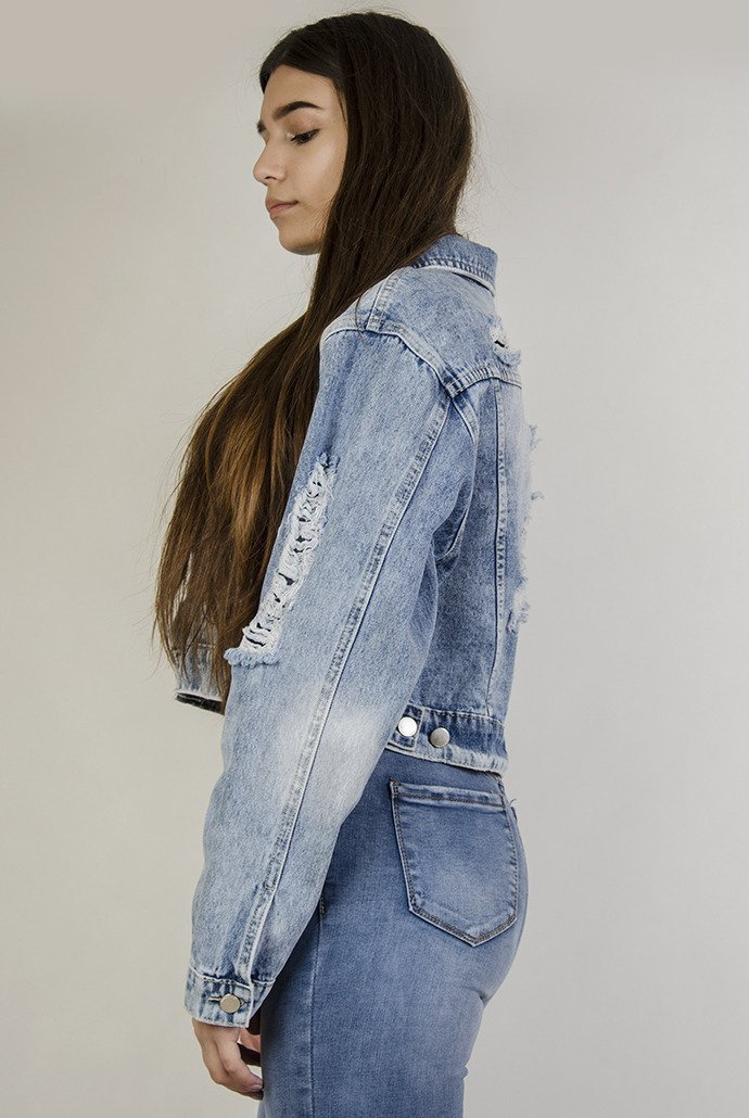 Kurtka jeansowa krótka z przetarciami oraz szarpaniami