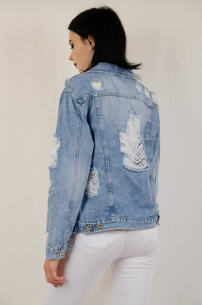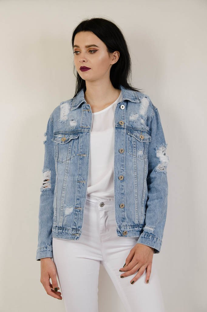 Kurtka jeansowa w jaśniejszym odcieniu jeansu, z licznymi przetarciami.