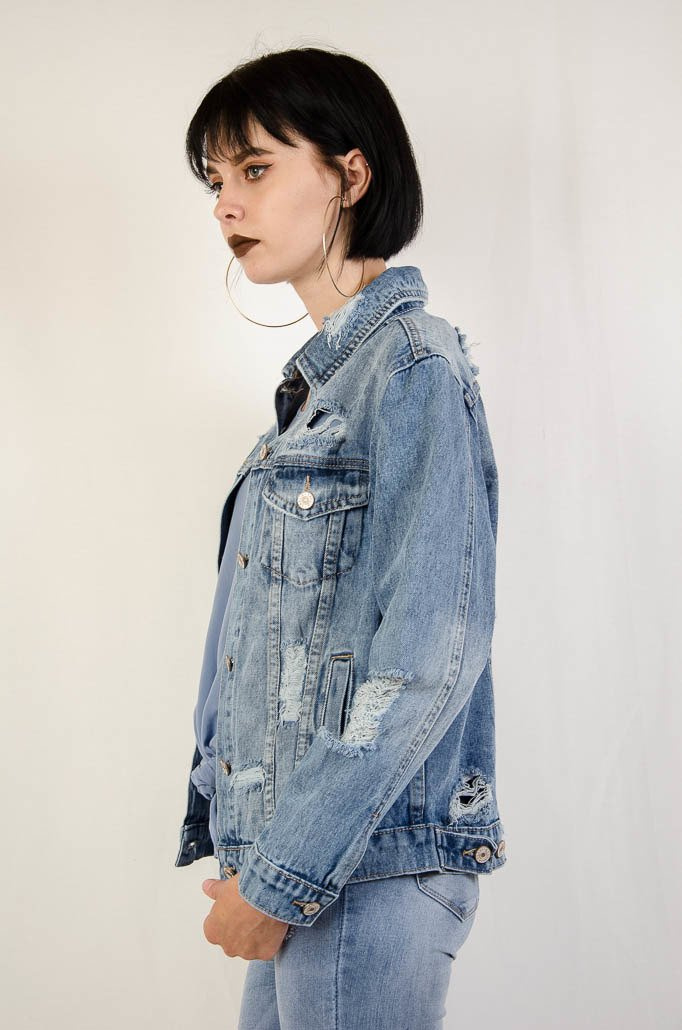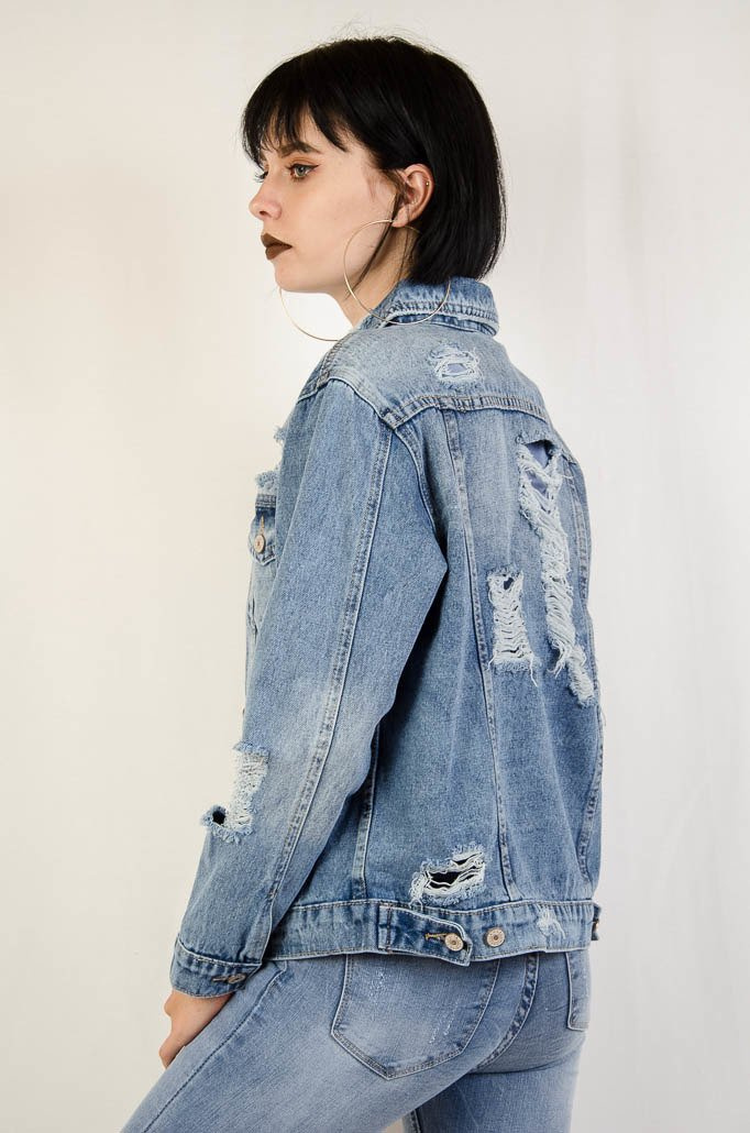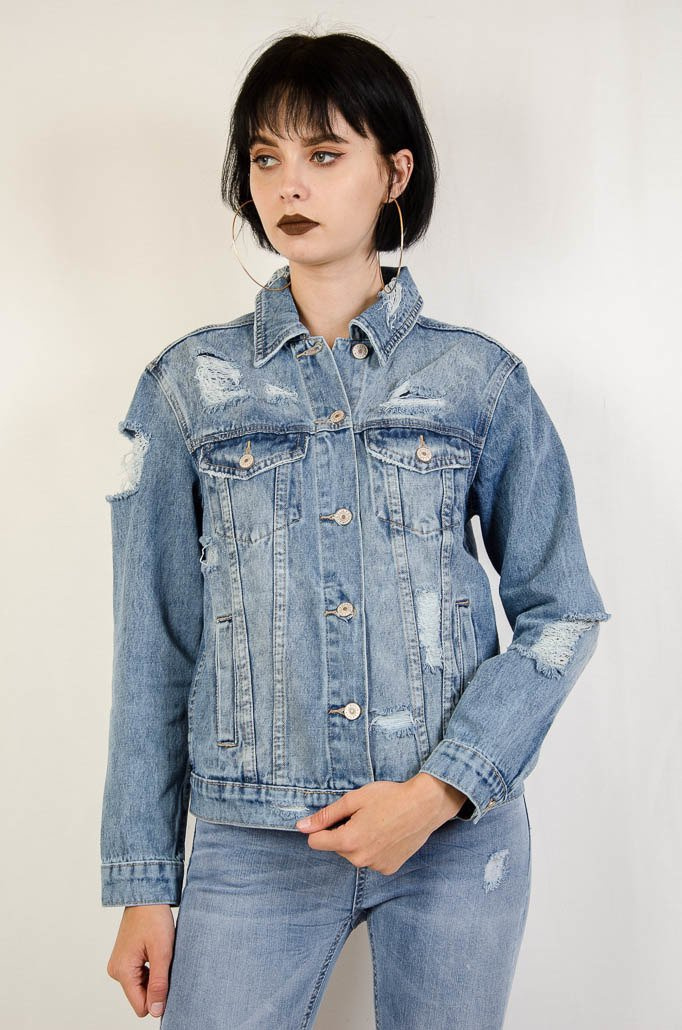 Kurtka jeansowa zapinana na guziki, z przetarciami.