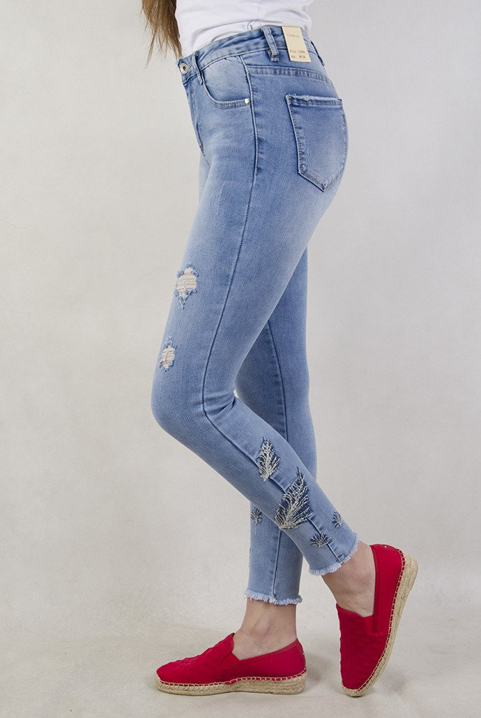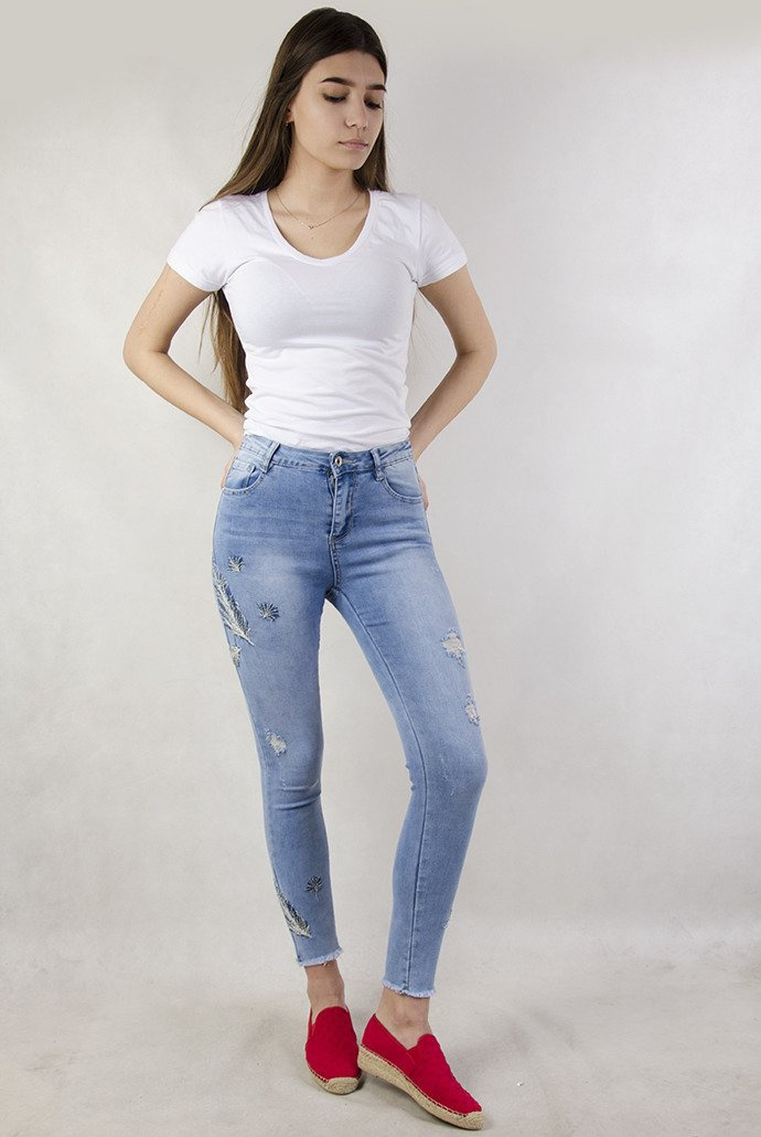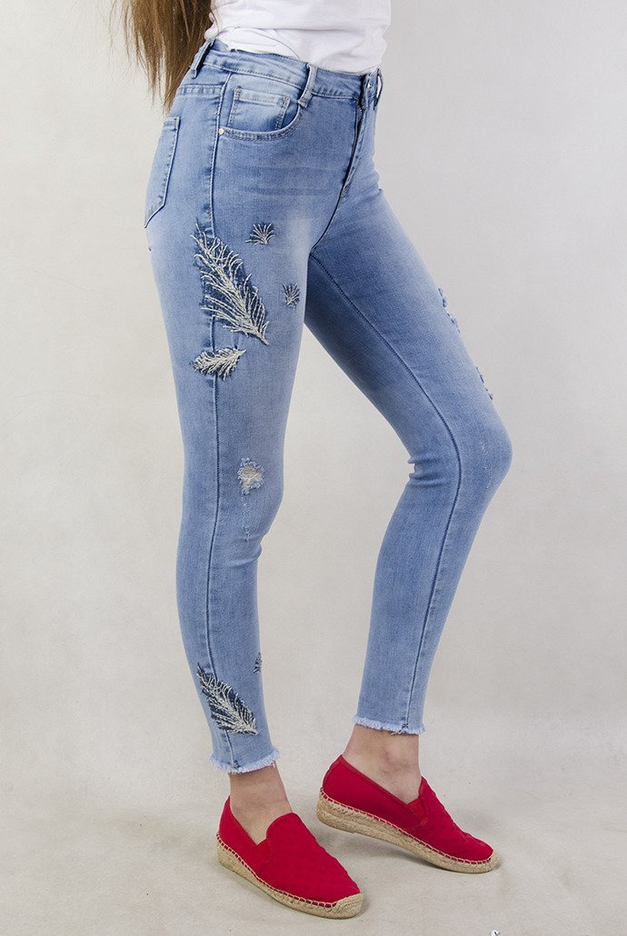 Jasne spodnie jeansowe z wyszywanymi piórkami