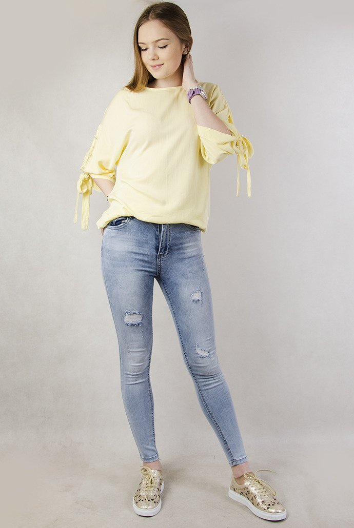 Żółta asymetryczna bluzka z wiązaniem przy rękawie oraz perełkami