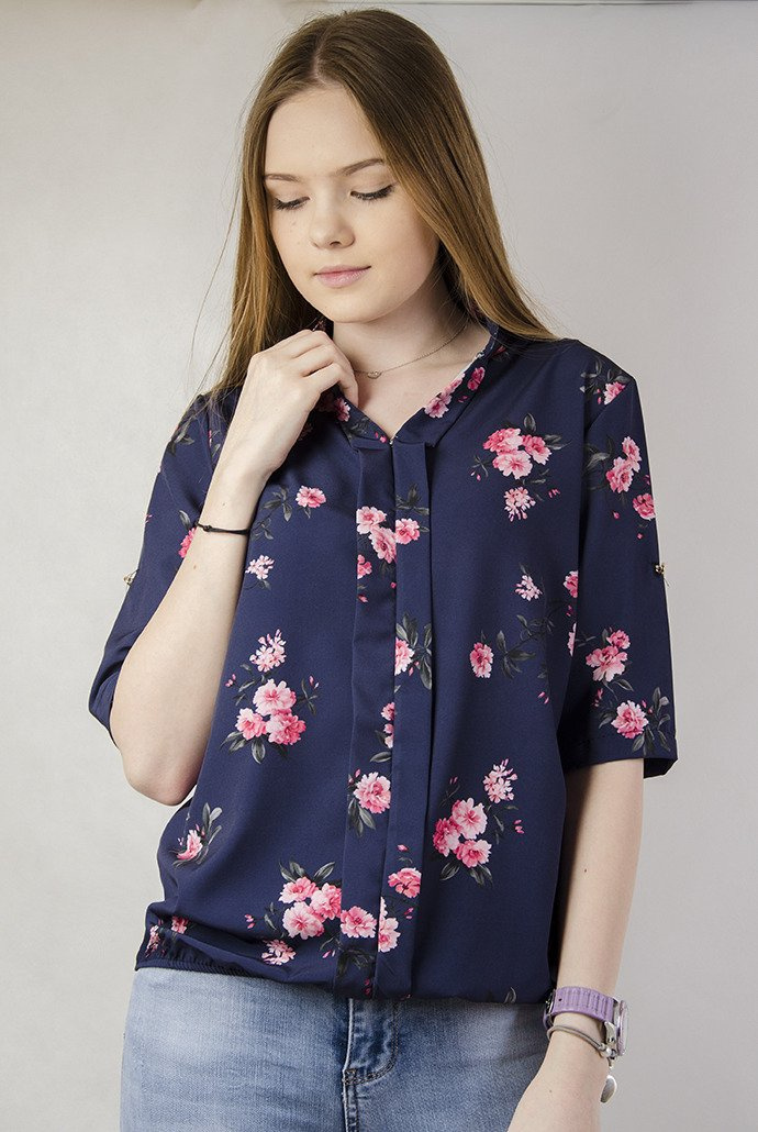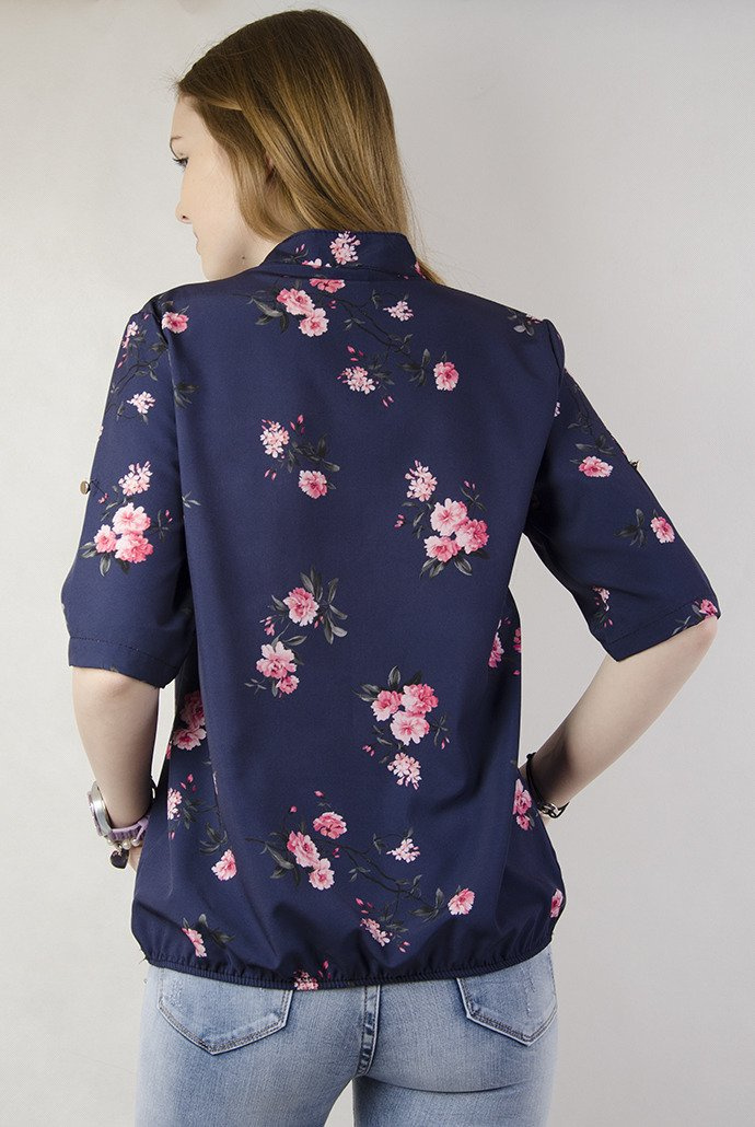 Granatowa bluzka w kwiaty, rękaw 3/4