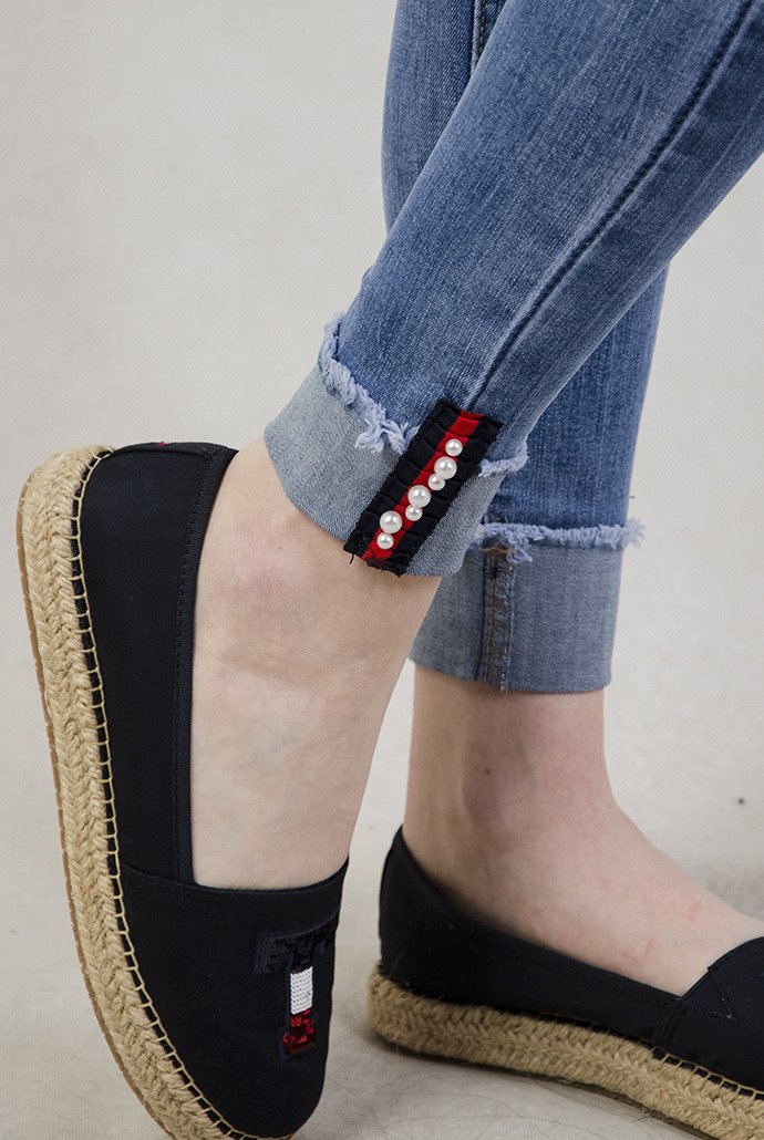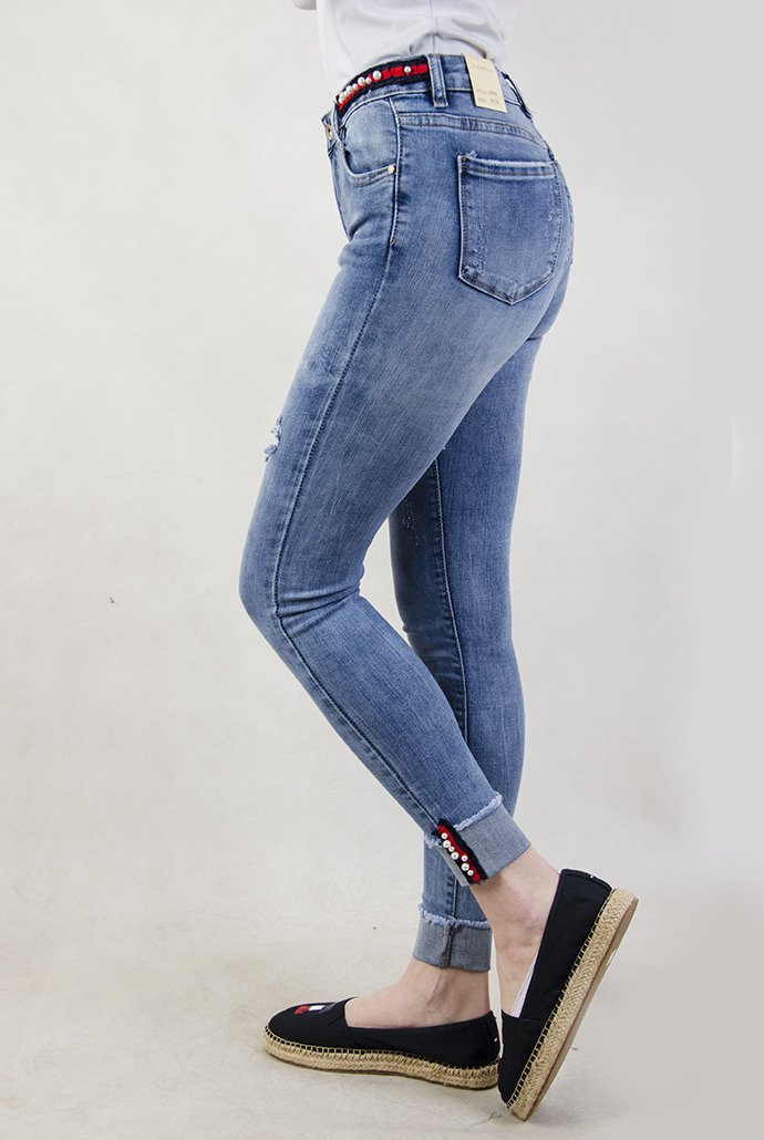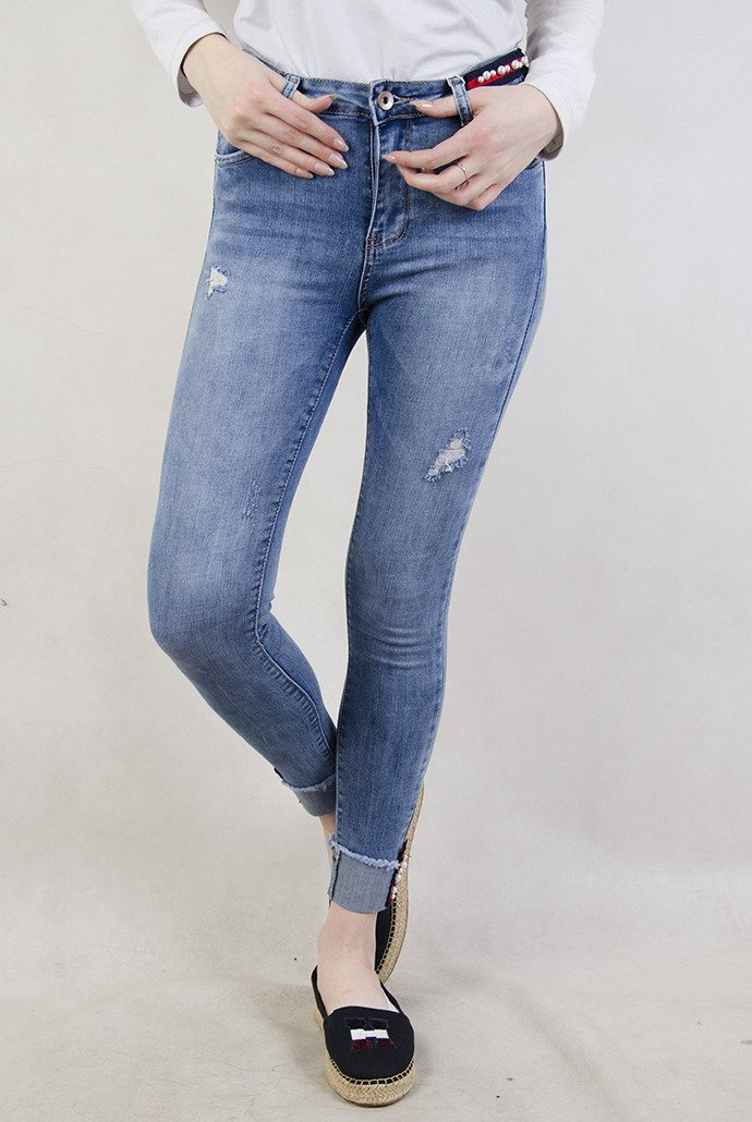 Spodnie jeansowe z ozdobami oraz wywinięta nogawką