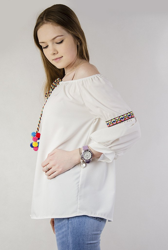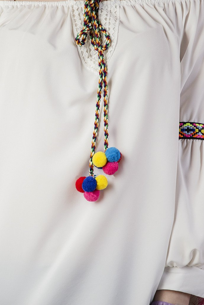 Biała bluzka hiszpanka z pomponami