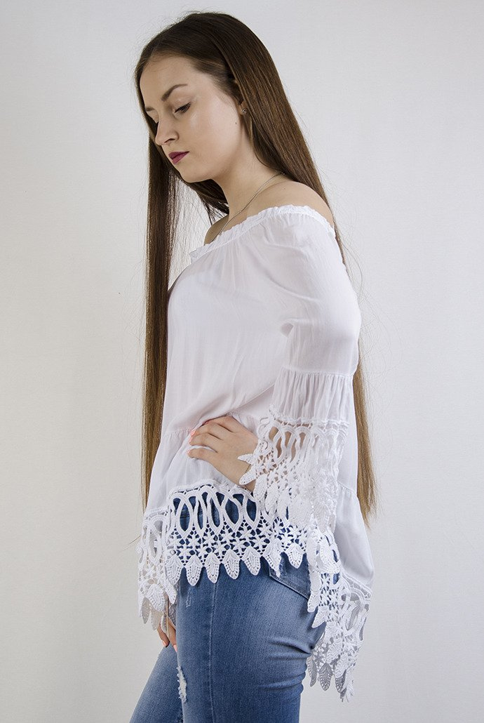 Biała bluzka z hiszpańskim dekoltem i ażurowymi wstawkami