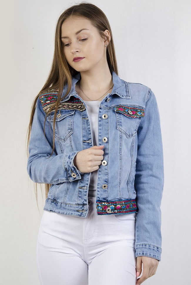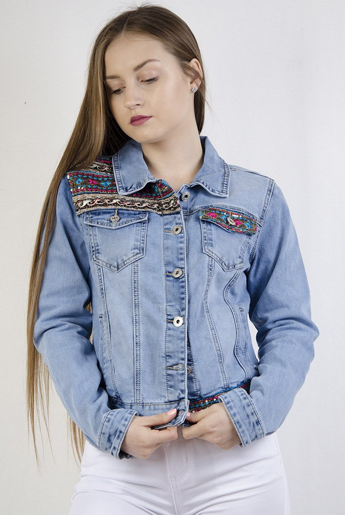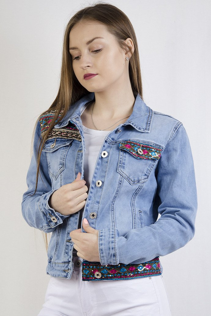 Kurtka jeansowa zdobiona przy kieszeniach i na dole