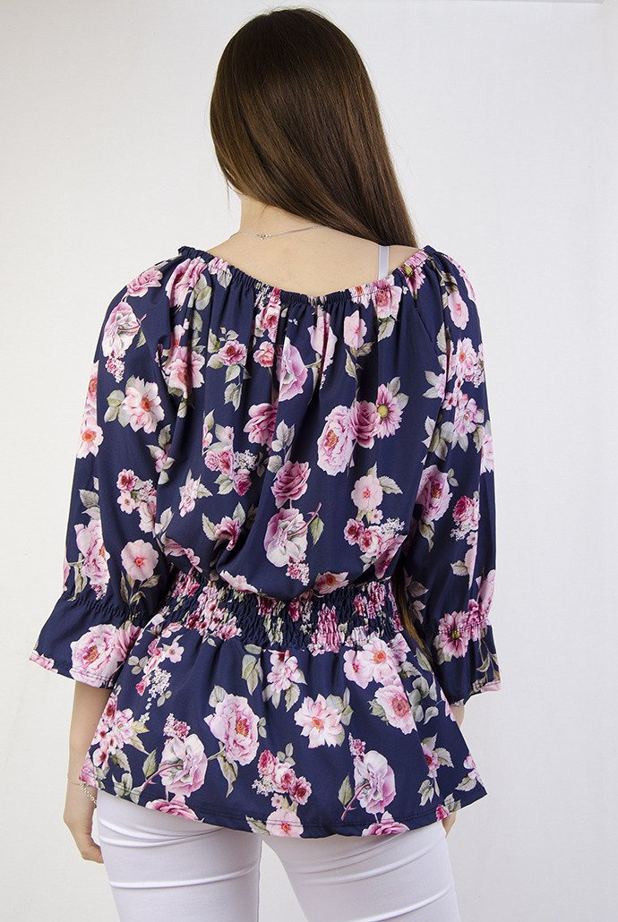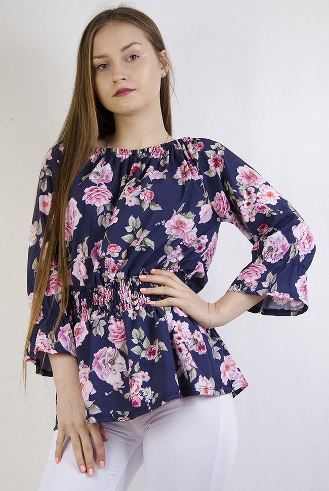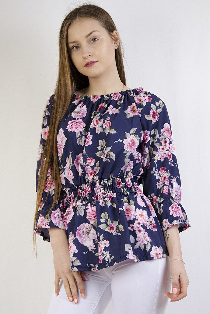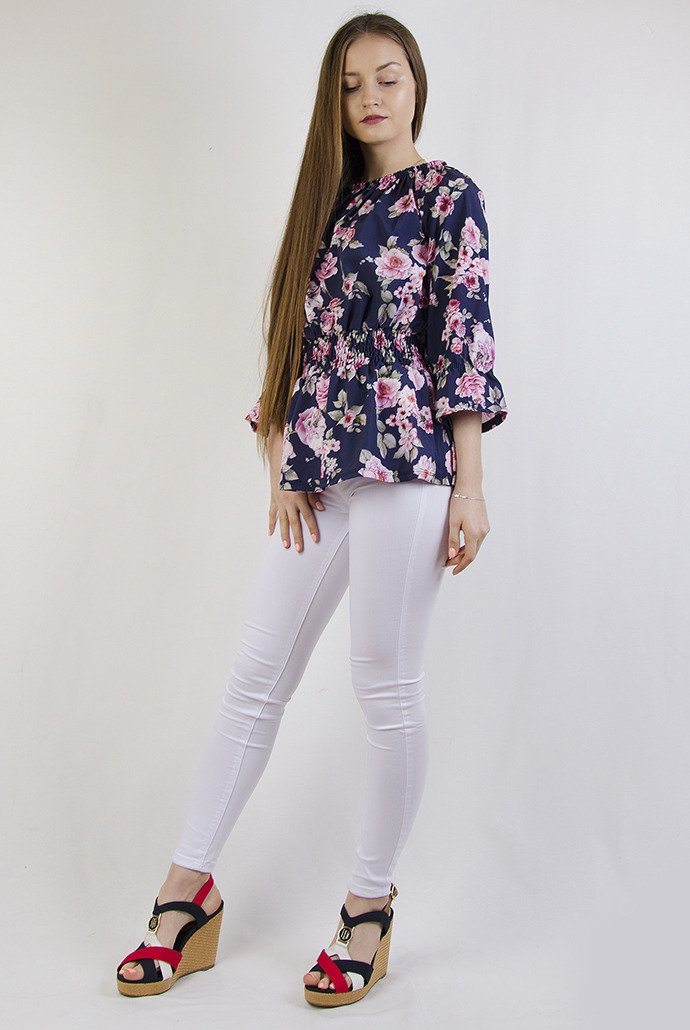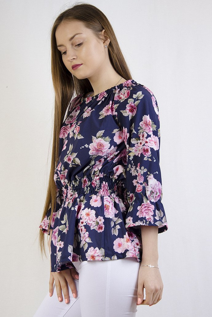 Granatowa bluzka w kwiaty ze ściągaczem w pasie