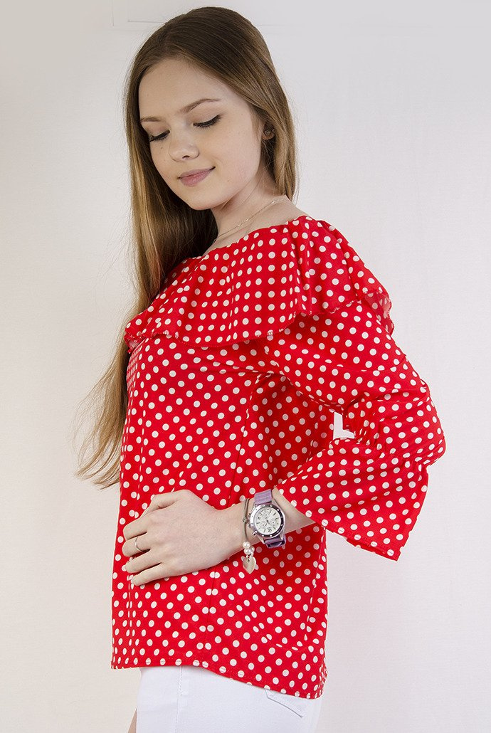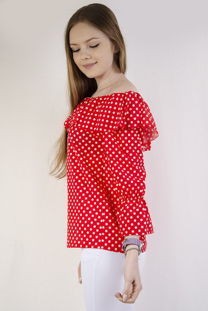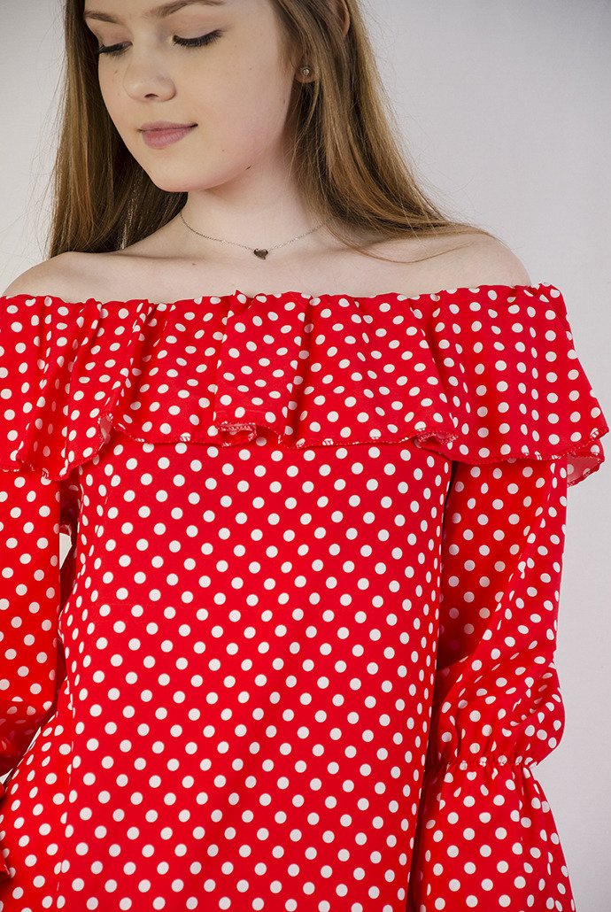 Czerwona bluzka z hiszpańskim dekoltem w grochy