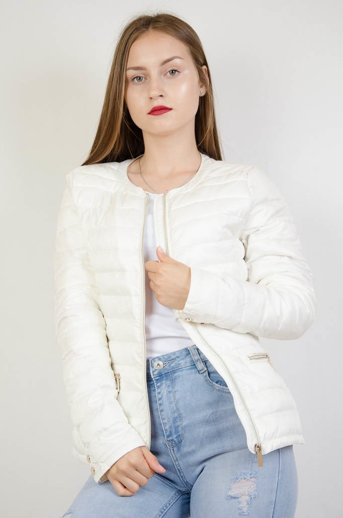 Biała kurtka pikowana z zamkami przy kieszeniach.